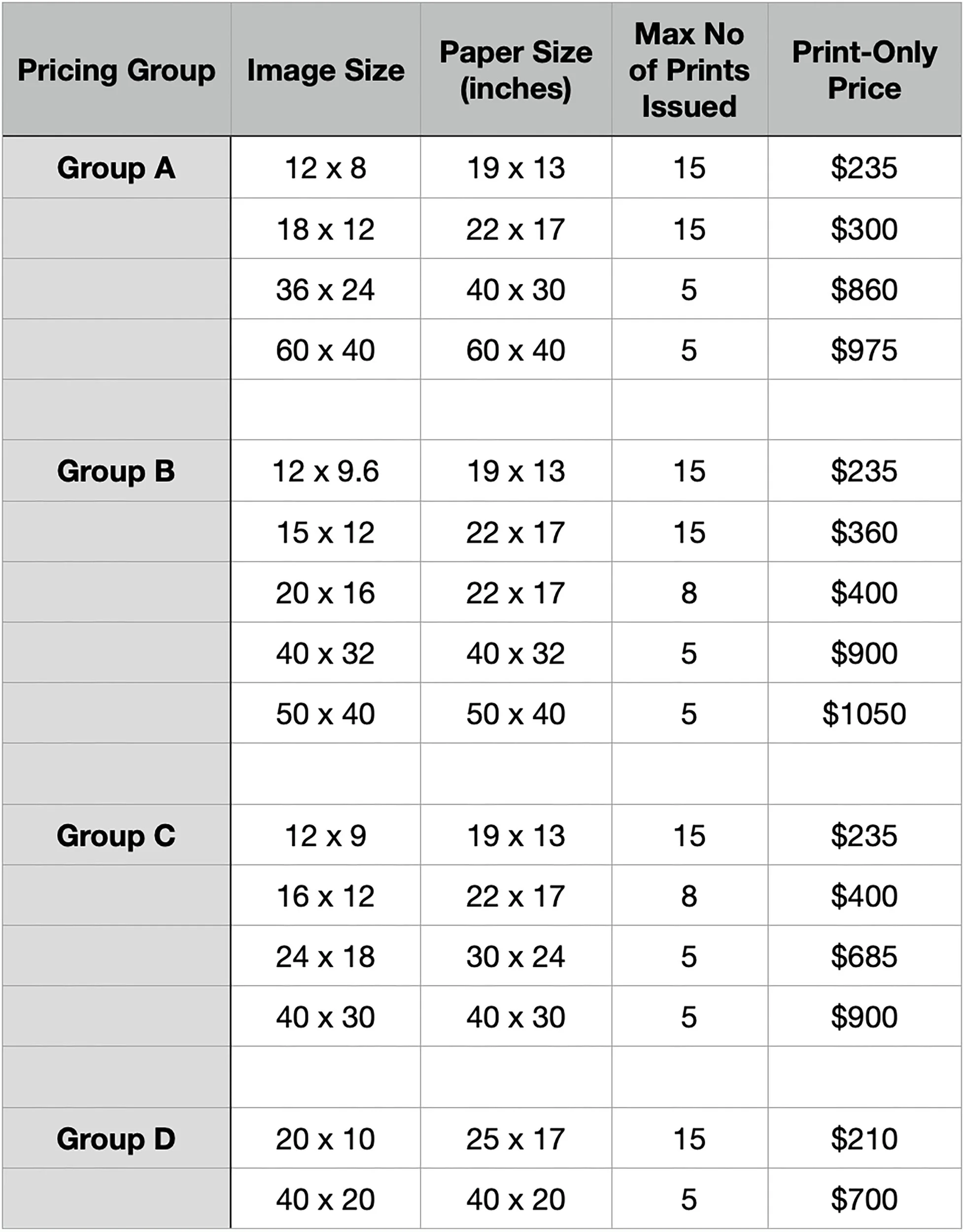 Price is determined by print category (LE or OE), print size, and print finish (print only, mount and mat, mount, mat, and frame).